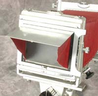 Focus is by moving either standard with two knobs that are connected to the rack and pinion mechanism hidden under the V. Focus lock was by a lever under each knob, but collars that are tightened to lock the knobs soon replaced the original levers. The top of the front standard has an accessory attachment point for a bellows lens hood, shown below on a Graphic View II. The lens hood is hard to find now and can cost half as much as an entire camera. It is really pretty for display, but a hat held in your non-release hand is much less trouble, very effective, less expensive and easier to carry. The accessory mount on top of the front standard can also hold an accessory bracket for a Graflite flash. The flash is held sideways. The attachment point is essentially a screw and its hole. The screw is often missing in used cameras. Unless you want to mount an accessory or find the empty screw hole objectionable, the loss of the screw is not too serious.